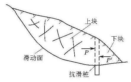 为防止边坡或地基滑动,保持其稳定性而采用的桩式支挡结构。 当边坡或水工建筑物地基不能满足抗滑稳定要求,存在较明显的滑动面及滑动面以下的岩体比较完整时,穿过可能滑动面设置抗滑桩是一种提高抗滑稳定性的有效措施。抗滑桩施工简便,不需大量开挖,在滑动面倾角较缓时,处理效果更好。在水利工程中常用于处理深层滑动、非塑性滑坡及岩层内埋藏数层软弱夹层情况,有大截面抗滑桩和承重阻滑桩两类。滑动体及抗滑桩如图1所示。