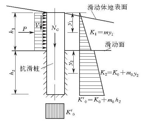 抗滑桩的设计方法和步骤如下。 (1)假定滑动体处于临界状态,用能量法、剩余推力法、分块极限平衡法或弹塑性有限元方法进行反演分析,求得滑动面上的抗剪强度指标(tanφ,φ为摩擦角)和c(黏聚力),并计算出天然下滑力曲线。 (2)分析滑动体的设计情况,按规定的安全系数,降低滑动面上的tanφ和c值,计算设计情况的下滑力曲线,并根据地形、地质和施工条件选定桩位,确定桩位断面上的下滑力。 (3)初估桩距。桩的间距不宜过大,以免滑动体从两桩之间挤出;亦不宜过小,以免破坏桩间岩层结构,一般以2~5倍桩径为宜。通常在滑动体主轴线附近的间距要小些,两侧可大些。 (4)初估桩的断面与埋深。桩的断面应有足够抗弯刚度,宜设计成矩形或圆形,断面边长一般为1.5~4.0m。结合地质、施工条件初步选定埋深,一般要求有1/3~1/4桩长,且不少于2m嵌入较坚硬岩层。 (5)采用适当的抗力系数(K)或抗力系数随深度变化的比例系数(m)、桩锚固段的抗力系数(K0、m0)或弹性模量(E0)及泊松比(μ0),作出抗滑桩的荷载分布及结构分析计算简图,见图2。